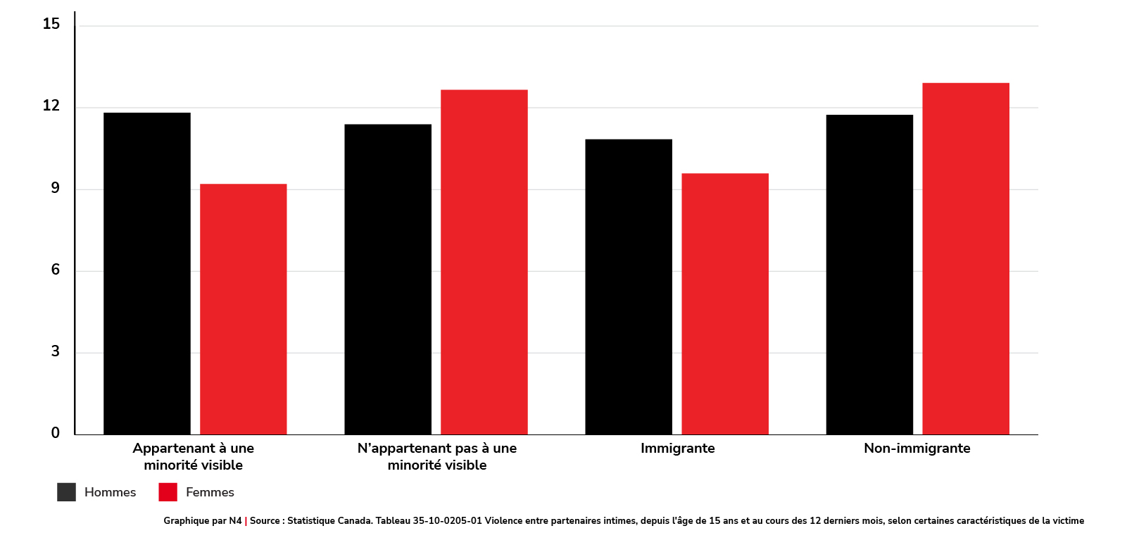 Source: Statistique Canada. Tableau 35-10-0205-01 Violence entre partenaires intimes, depuis l'âge de 15 ans et au cours des 12 derniers mois, selon certaines caractéristiques de la victime. https://www150.statcan.gc.ca/t1/tbl1/fr/tv.action?pid=3510020501&request_locale=fr